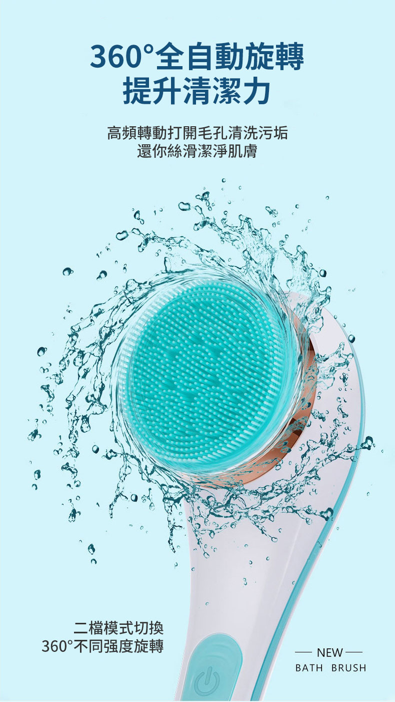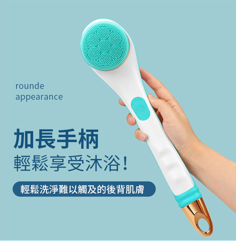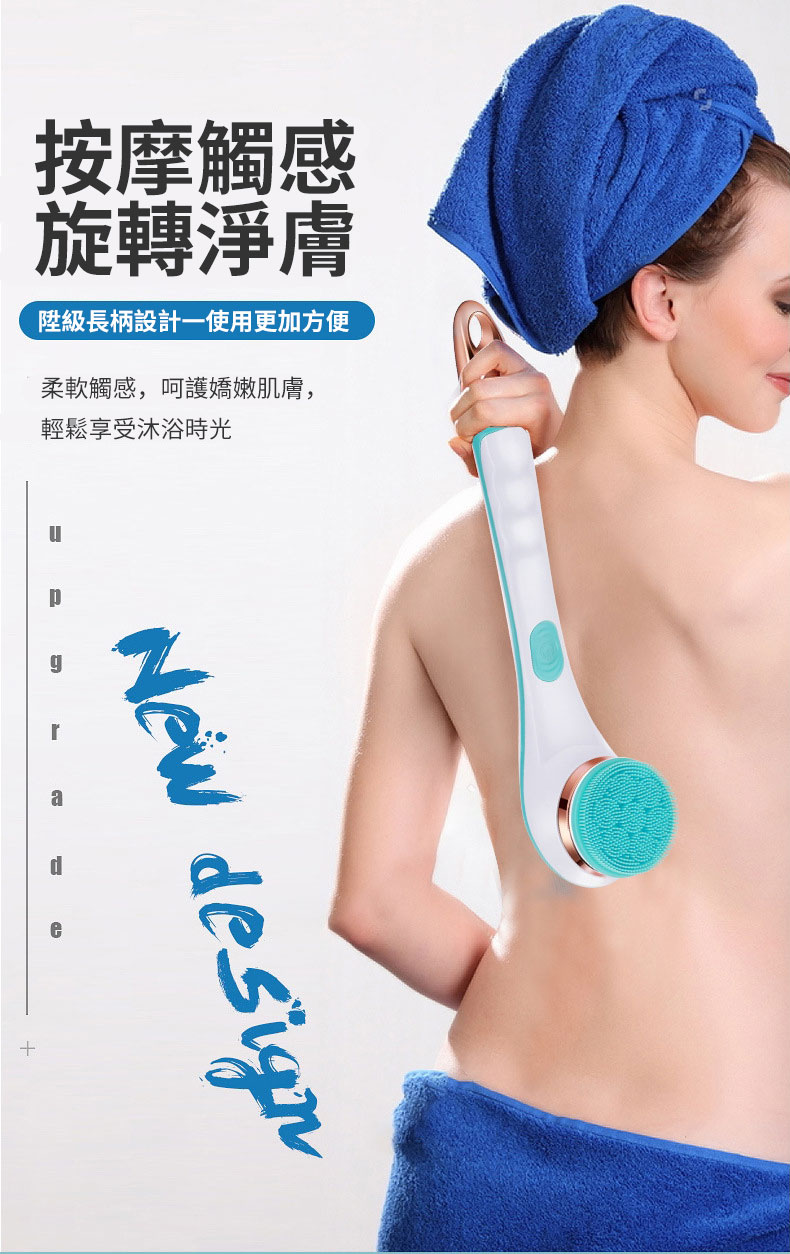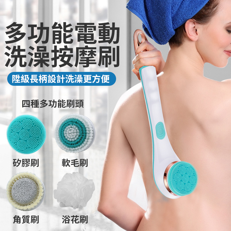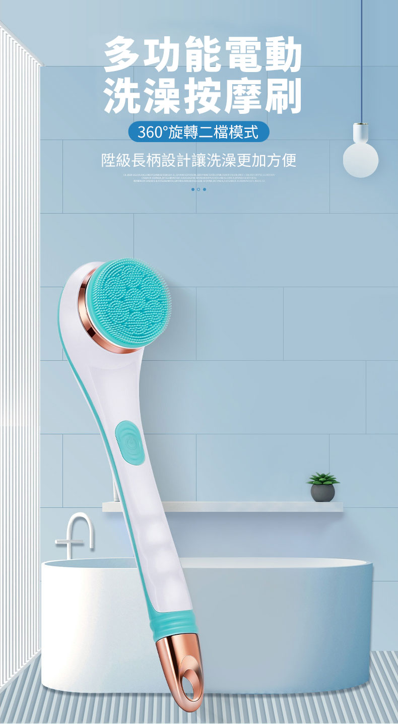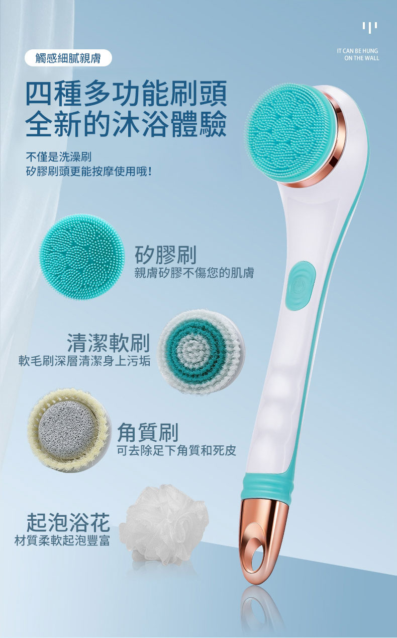 電動沐浴按摩刷洗澡神器强力自動長柄軟毛成人搓背搓泥搓澡機後背。居家SPA電動按摩沐浴刷,五款特色刷頭可替換使用,清新水藍色,防滑手柄好握好拿,