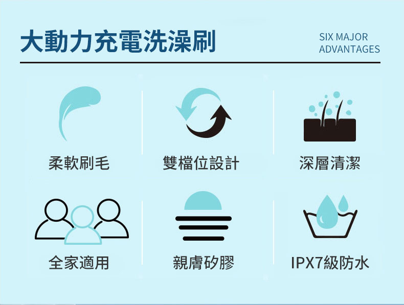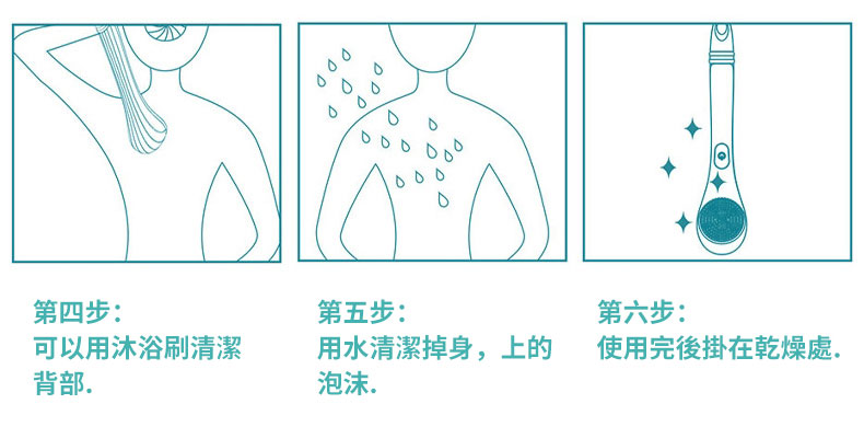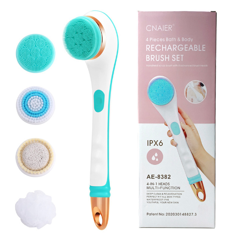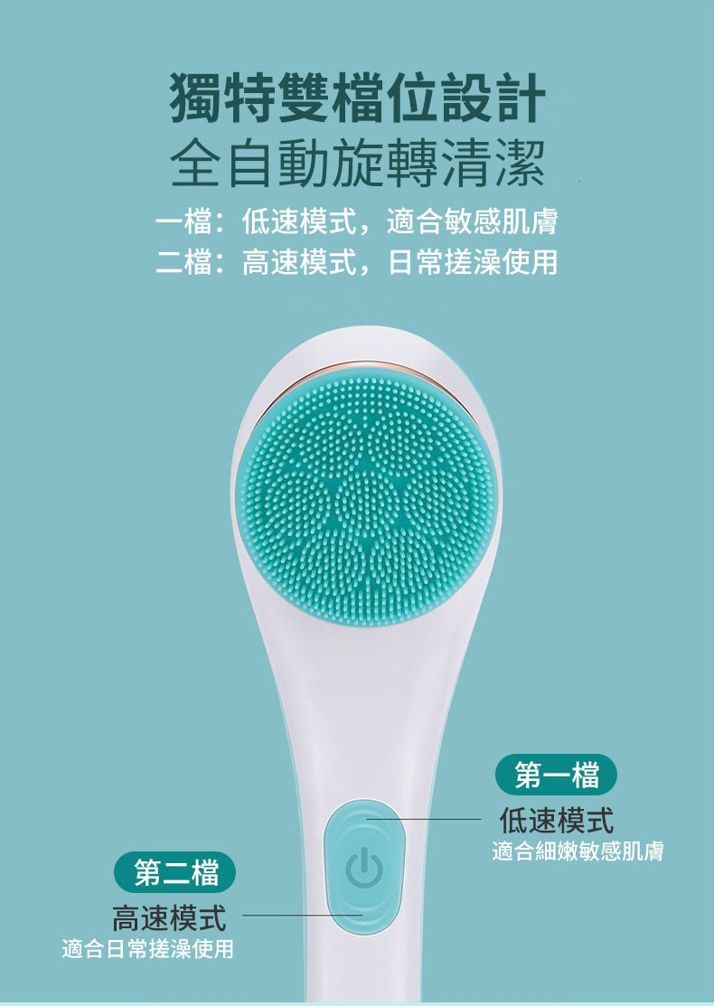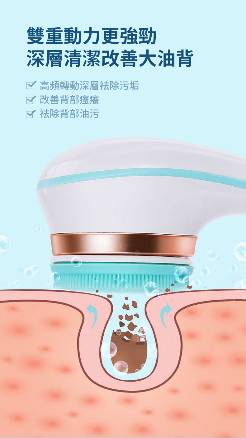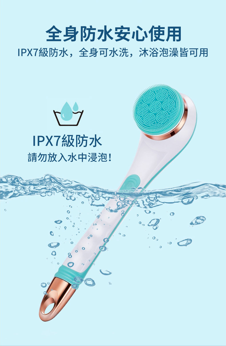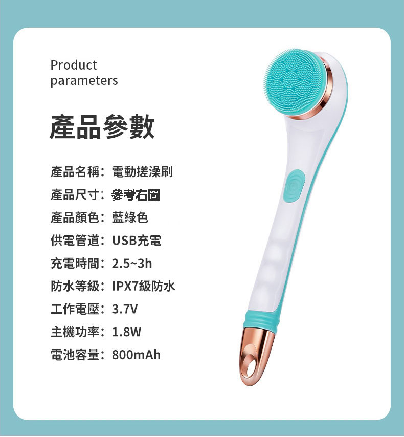 電動沐浴按摩刷洗澡神器强力自動長柄軟毛成人搓背搓泥搓澡機後背。居家SPA電動按摩沐浴刷,五款特色刷頭可替換使用,清新水藍色,防滑手柄好握好拿,